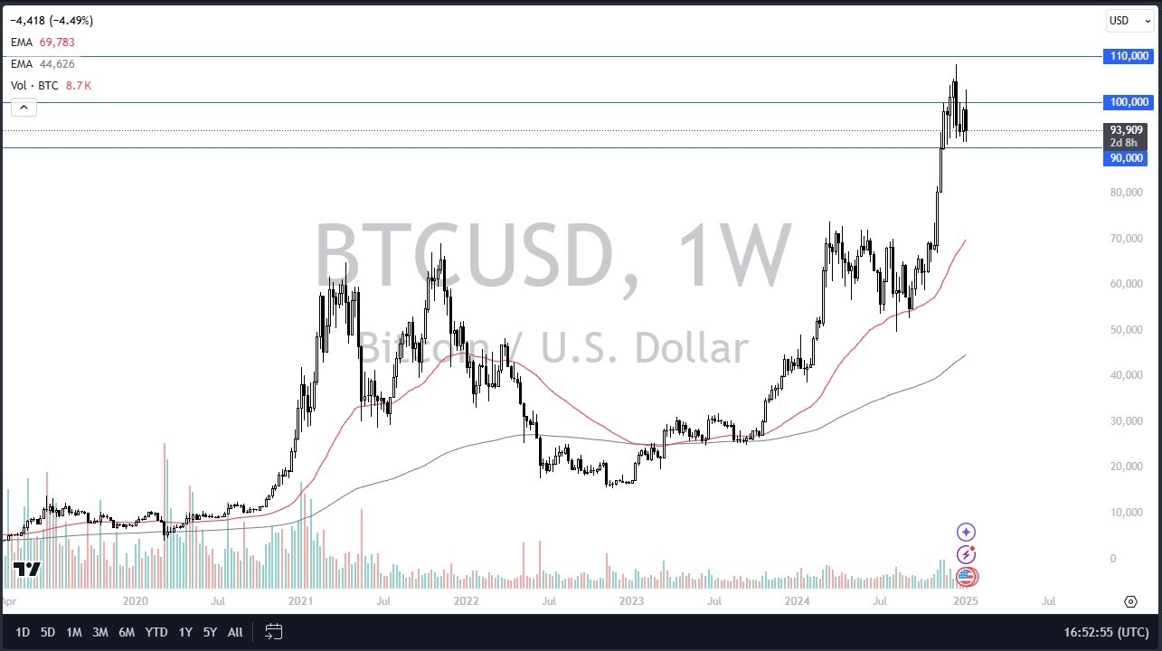 Bitcoin has gone back and forth during the course of the trading week, as we tried to break out to the upside and above the $100,000 level. However, we failed and ended up plummeting toward the $93,000 level yet again. This is an area that’s been pretty significant in support, and I think it will probably continue to be. Anything below the $88,000 level for me gets this market selling off quite drastically, perhaps dropping all the way down to the $74,000 level. On the other hand, if we can break above the top of the candlestick for the week, it opens up the possibility of a move back to the $109,000 level.