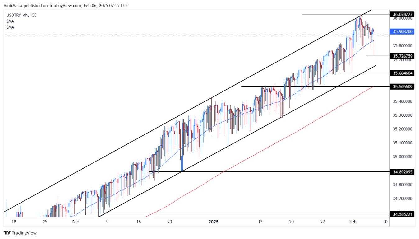 The USD/TRY (the dollar pair declined against the Turkish Lira) during early trading on Thursday morning, as the pair traded below the peak recorded yesterday at 36 liras. The pair received support from reports showing the Turkish government issuing its first dollar bonds this year, estimated at about $ 500 million, as the government seeks to borrow about $ 11 billion over the course of 2025. According to a Bloomberg report, the yield on seven-year bonds is expected to reach around 7.5%. The Treasury revealed that a number of global banks, including Citigroup, JPMorgan, and Goldman Sachs, are overseeing the issuance process. It is worth noting that recent government bond issuances have received high demand, with recent issuances being covered 3-4 times.